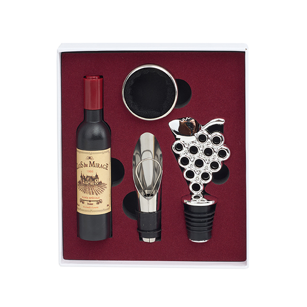 סט אביזרים מושלם ליין הכולל פותחן וחולץ פקקים, פיית מזיגה עם משפך, פקק וטבעת למניעת טפטופים. אידיאלי לשימוש ביתי או כמתנה חגיגית לאוהבי יין.