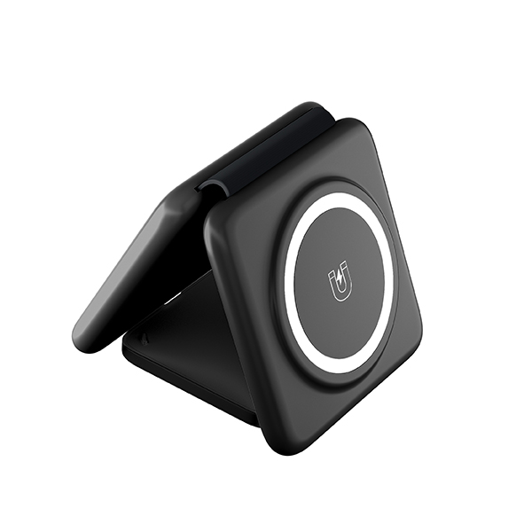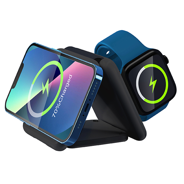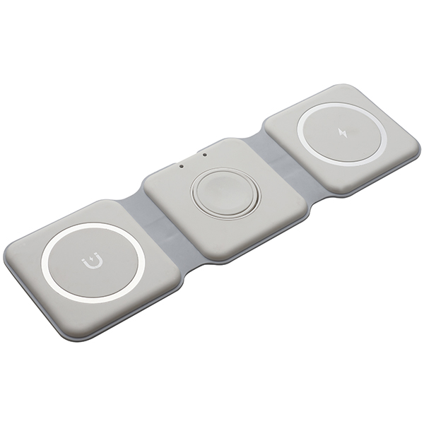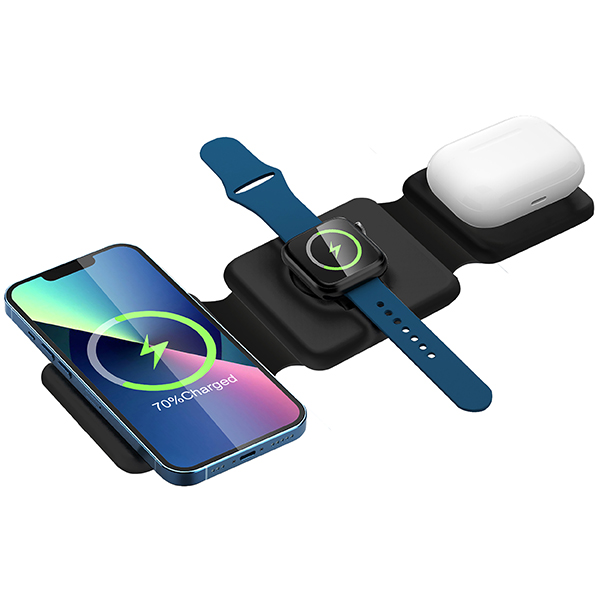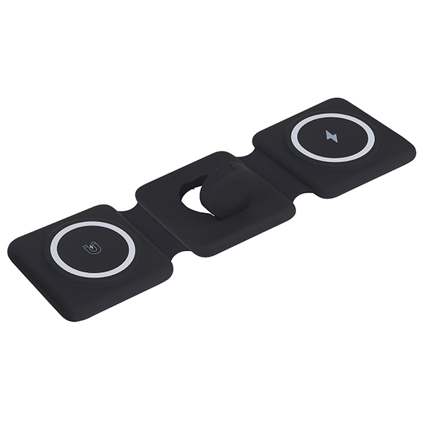 קומבו מטען אלחוטי מתקפל 3 ב-1 עם סליל כפול, תומך בטעינה מהירה לנייד עד 15W, לאוזניות עד 3W ולשעון חכם עד 2.5W, תואם למכשירי Qi, נטען באמצעות Type-C, מתאים למכשירי Android ו-iOS.