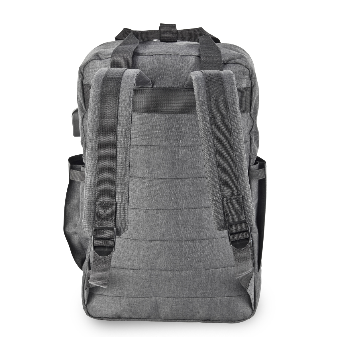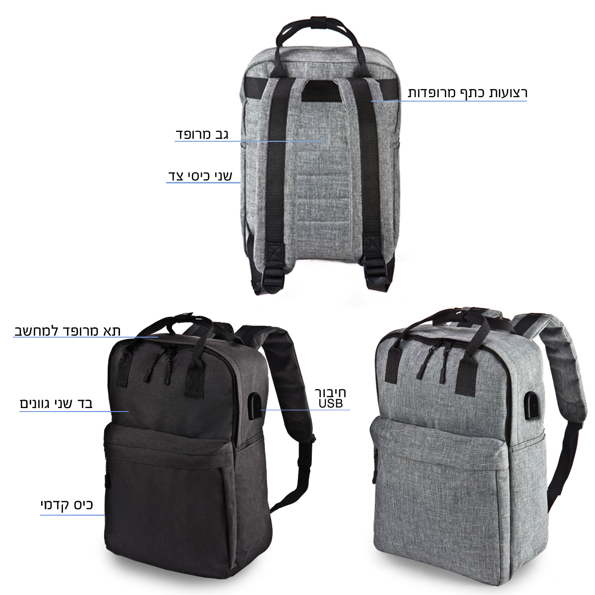 תיק גב איכותי העשוי מבד RPET המופק מ-30 בקבוקי 1.5 ליטר, בעיצוב פונקציונלי ושימושי ליום-יום. כולל תא מרכזי רחב עם כיס מרופד למחשב נייד “15, חיבור USB עם כבל לטעינה נוחה, כיס קדמי עם רוכסן ושני כיסי צד. הגב והרצועות מרופדים לנוחות מקסימלית לאורך כל היום.