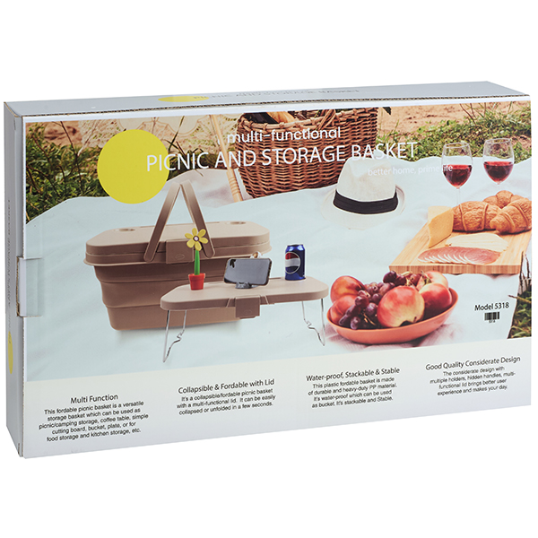 סלסלת פיקניק רב-תכליתית ומעוצבת לחוויית חוץ מושלמת. סלסלה חכמה המתקפלת בקלות לאחסון קומפקטי, עם ידיות נשיאה עמידות לנוחות מרבית. המכסה משמש גם כשולחן קטן. אידיאלי לפיקניקים, קמפינג או זמן איכות בחיק הטבע.